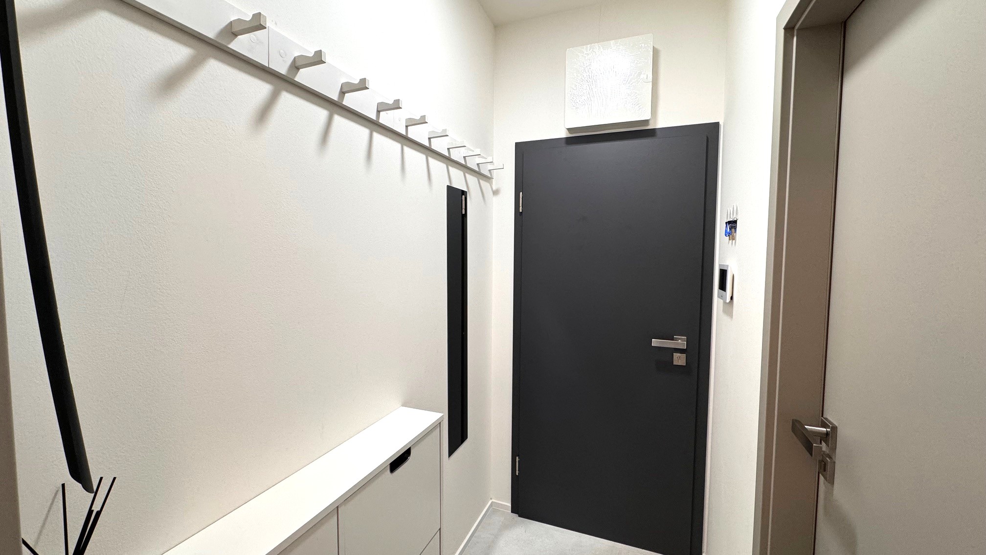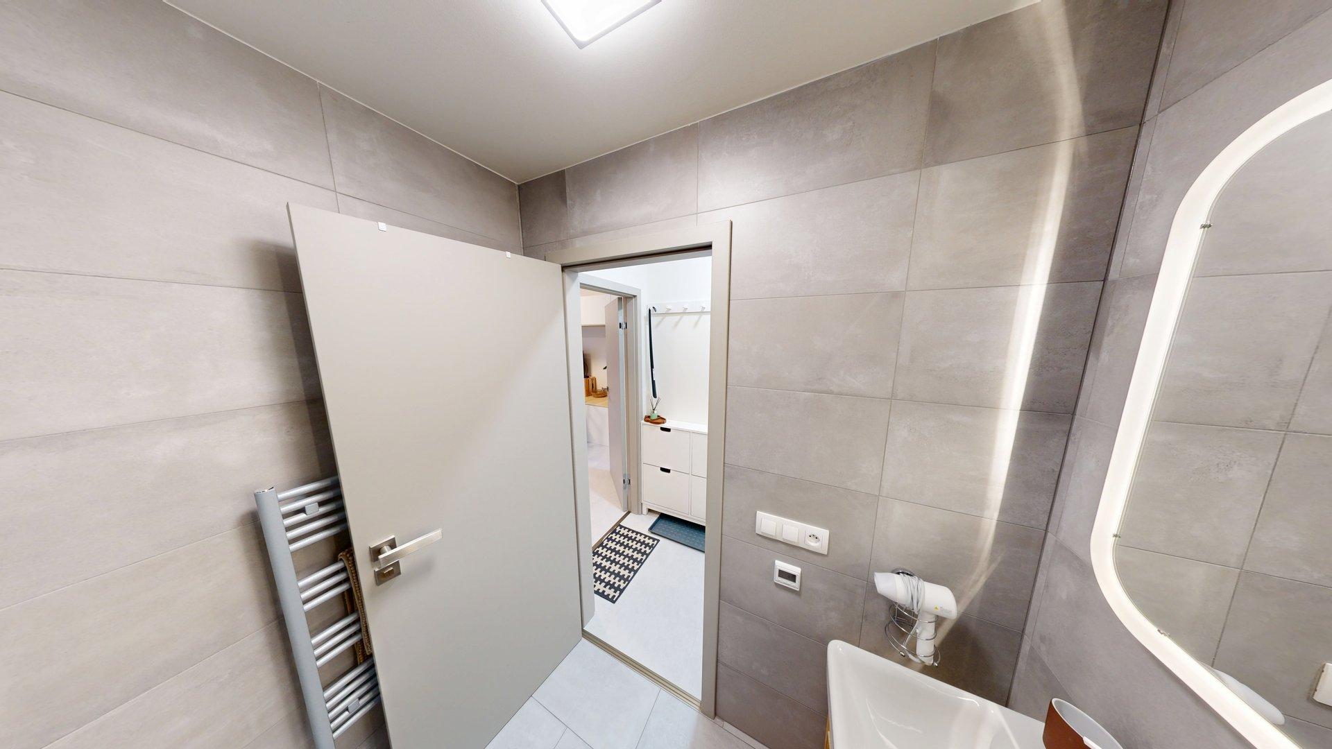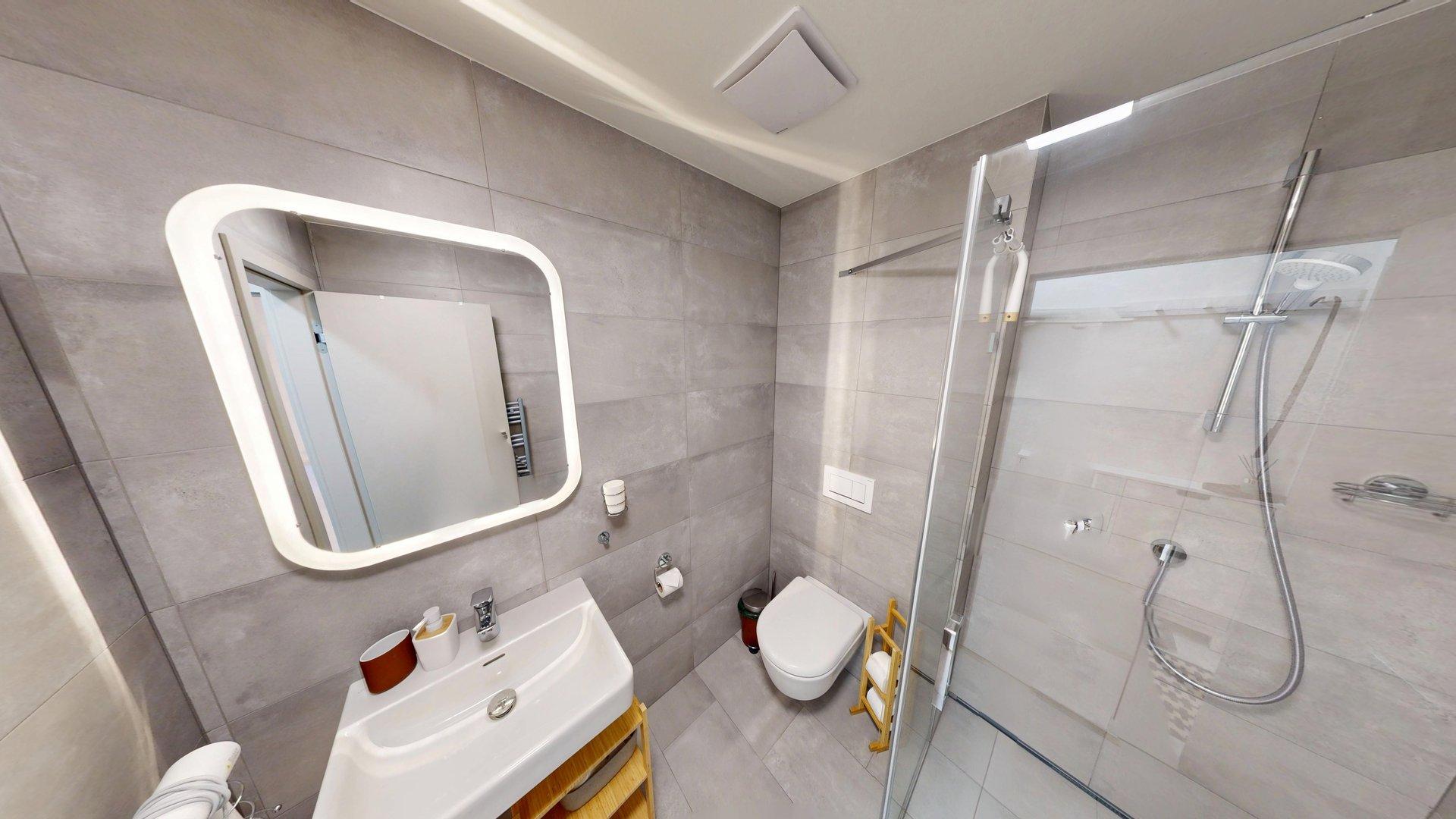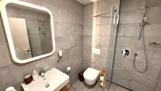 Koupelna je vybavená sprchou a WC. Podlahové vytápění s dálkovým ovládáním, které umožňuje spuštění topení před příjezdem a tepelnou pohodu.