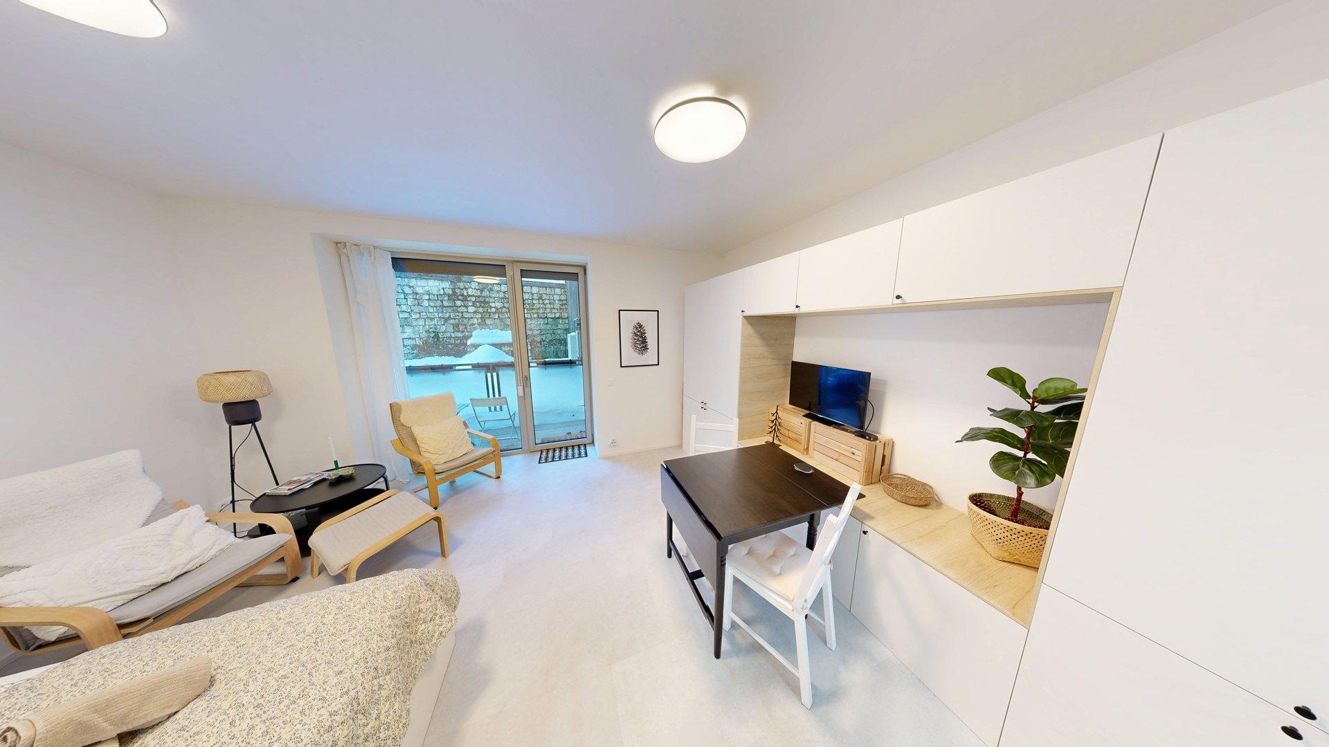 Prostorný obývací pokoj s kuchyňským koutem s kompletním vybavením a balkón s výhledem do zahrady.