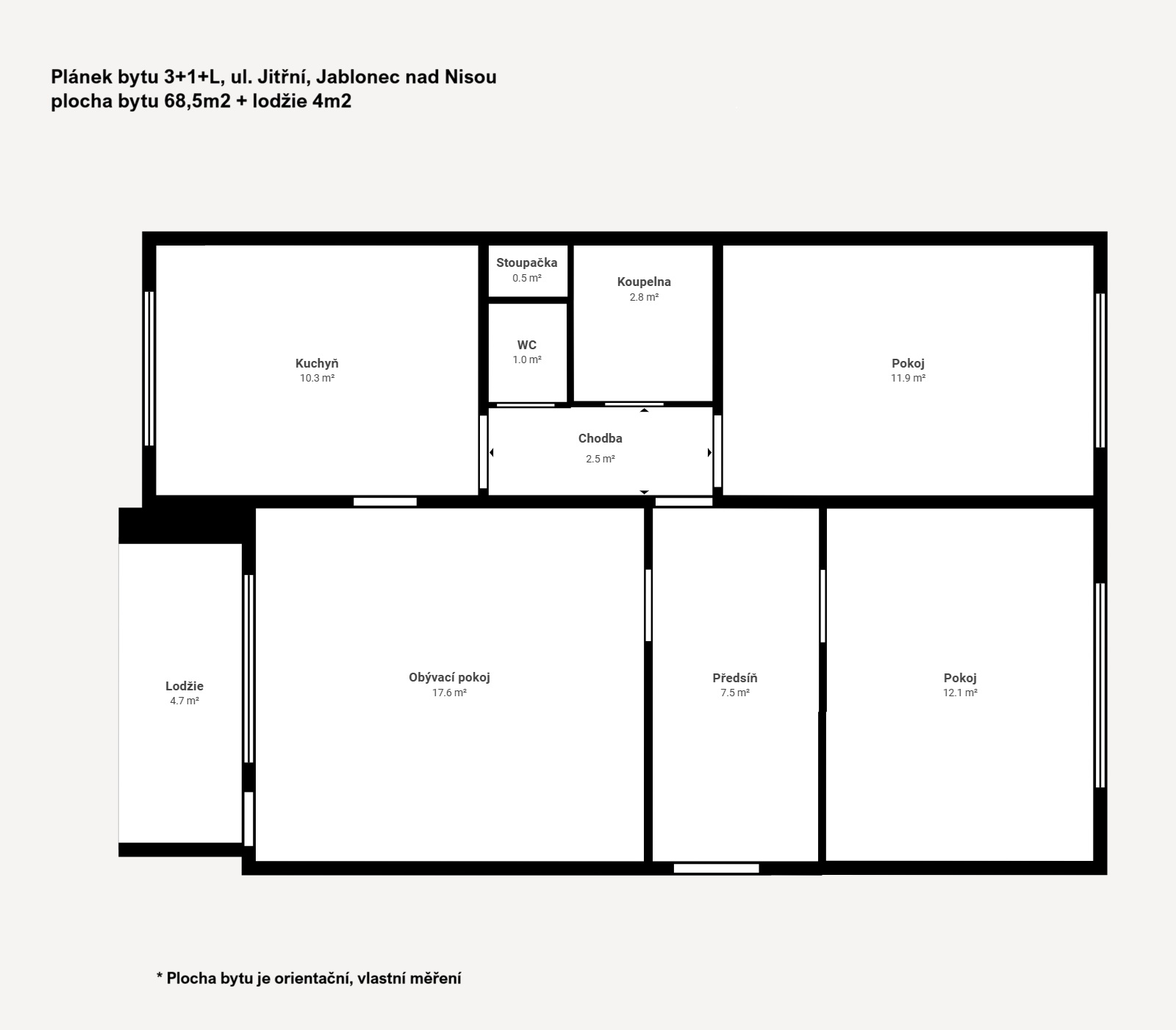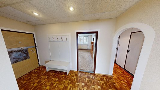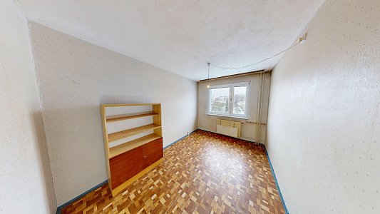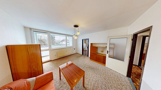 Dispozice bytu: předsíň (chodba), pokoj 12,3 m2, pokoj 12 m2, obývací pokoj 17,9 m2, lodžie 4m2 (jižní strana), kuchyň 10,4 m2, chodba, koupelna, WC a příslušenství mimo byt - sklepní kóje. Provozní náklady 4,337,- Kč/měs. + elektřina.