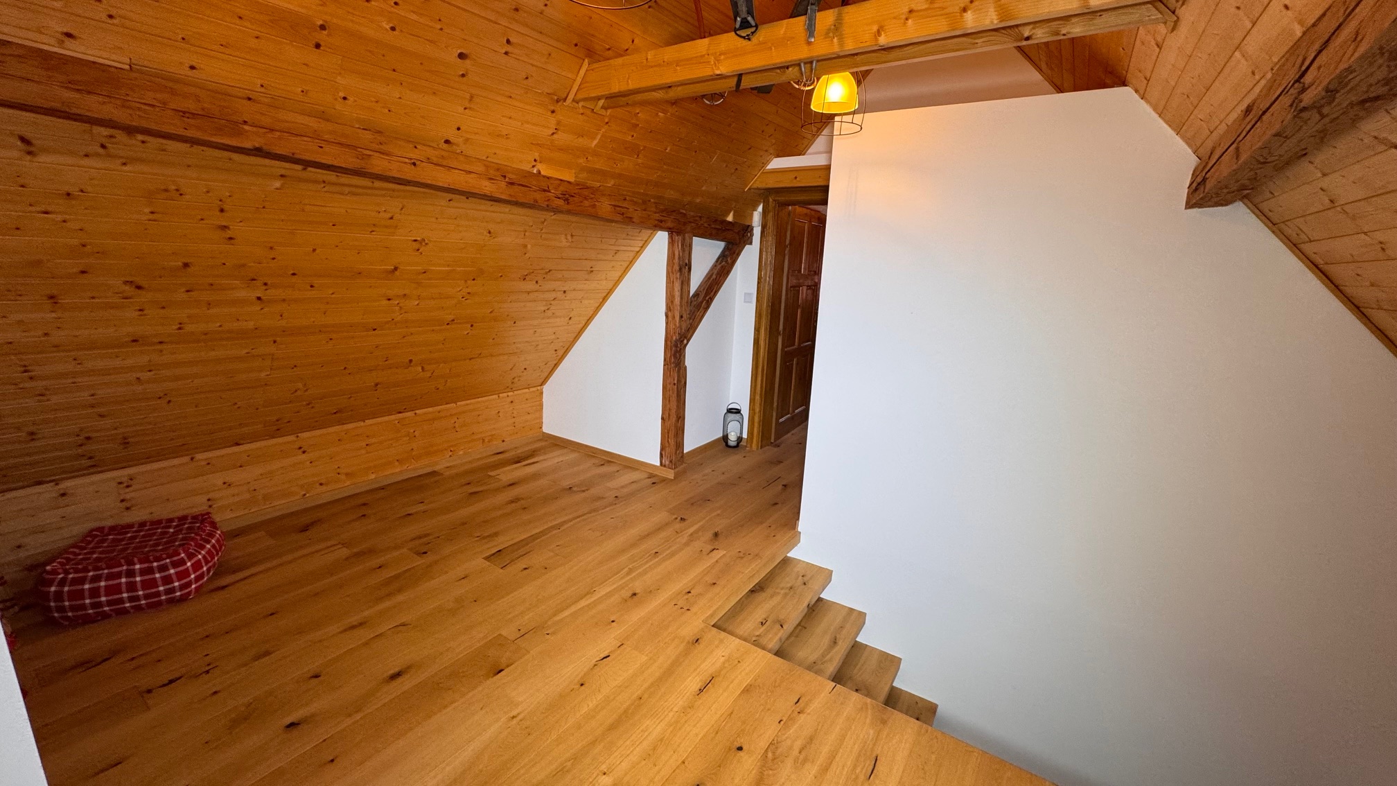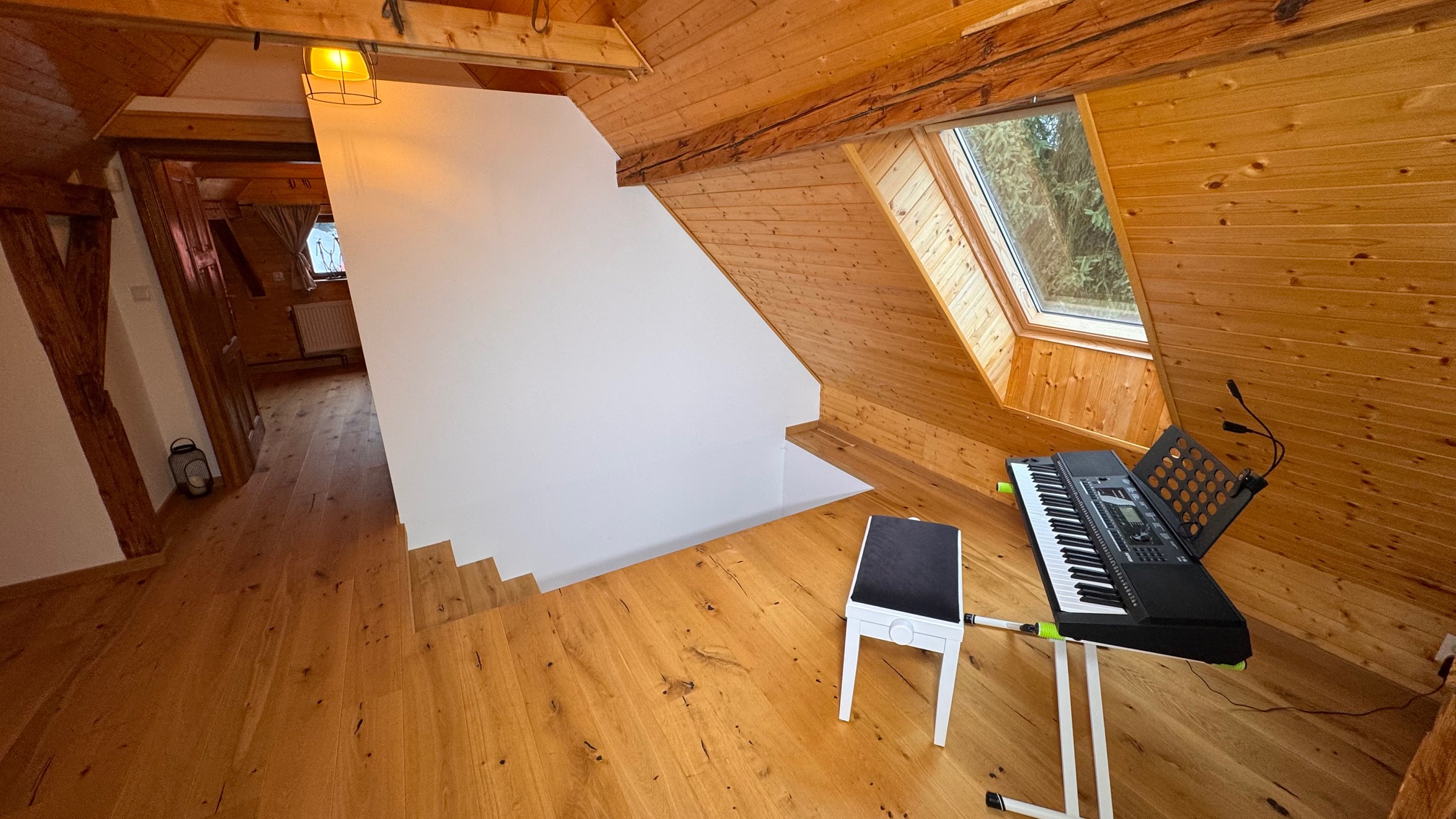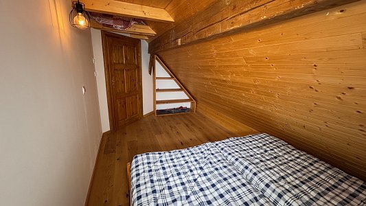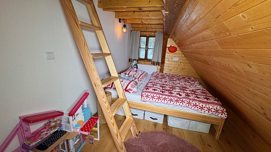 V podkroví se nacházejí tři pokoje, samostatné WC a prostorná chodba, přičemž dva pokoje mají vstup do podkrovního prostoru na spaní, což poskytuje dostatek místa pro rodinu či přátele.