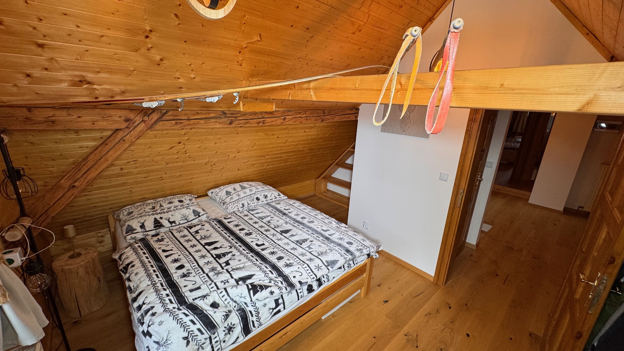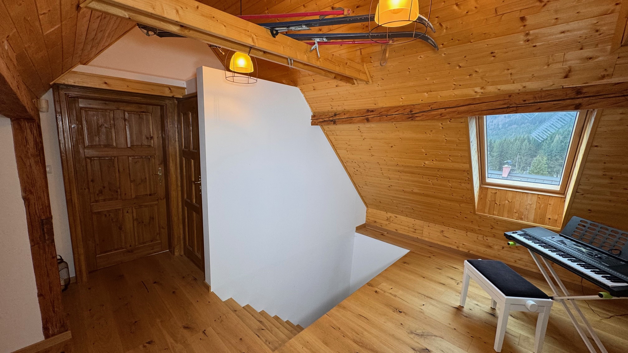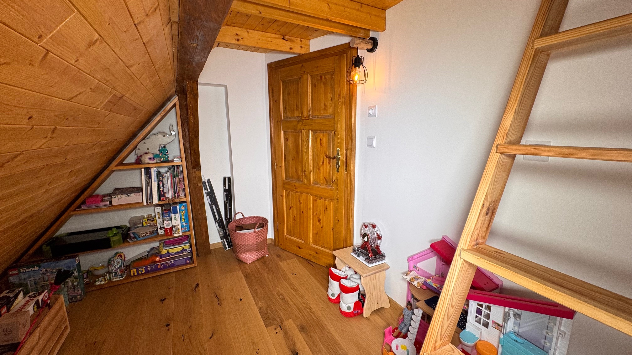 V podkroví se nacházejí tři pokoje, samostatné WC a prostorná chodba, přičemž dva pokoje mají vstup do podkrovního prostoru na spaní, což poskytuje dostatek místa pro rodinu či přátele.