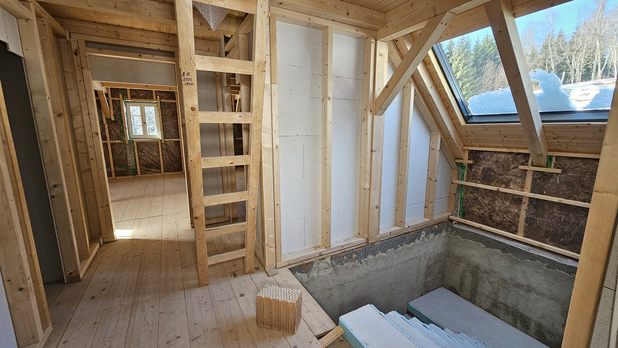 Ve 2.NP se nachází střední chodba se schodištěm, která vede do tří pokojů, koupelny a samostatného WC. Z chodby je také přístup na půdu, což poskytuje další možnosti pro úložné prostory nebo budoucí úpravy.