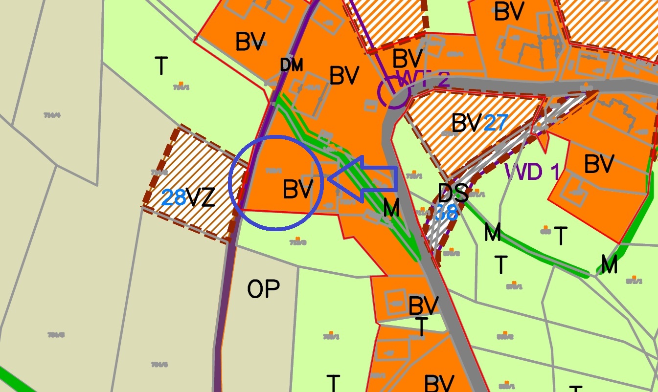 Pozemek je dle územního plánu charakterizován jako plocha BV venkovská obytná zástavba smíšená. Podmínky prostorového uspořádání umožňují výstavbu domů s 1 až 2 nadzemními podlažími, přičemž je možné zřídit podsklepení a podkroví. Důležité je dodržet maximální koeficient zastavění pozemku KZP = 0,30 a intenzitu využití pozemku s minimálním koeficientem zeleně 0,45.